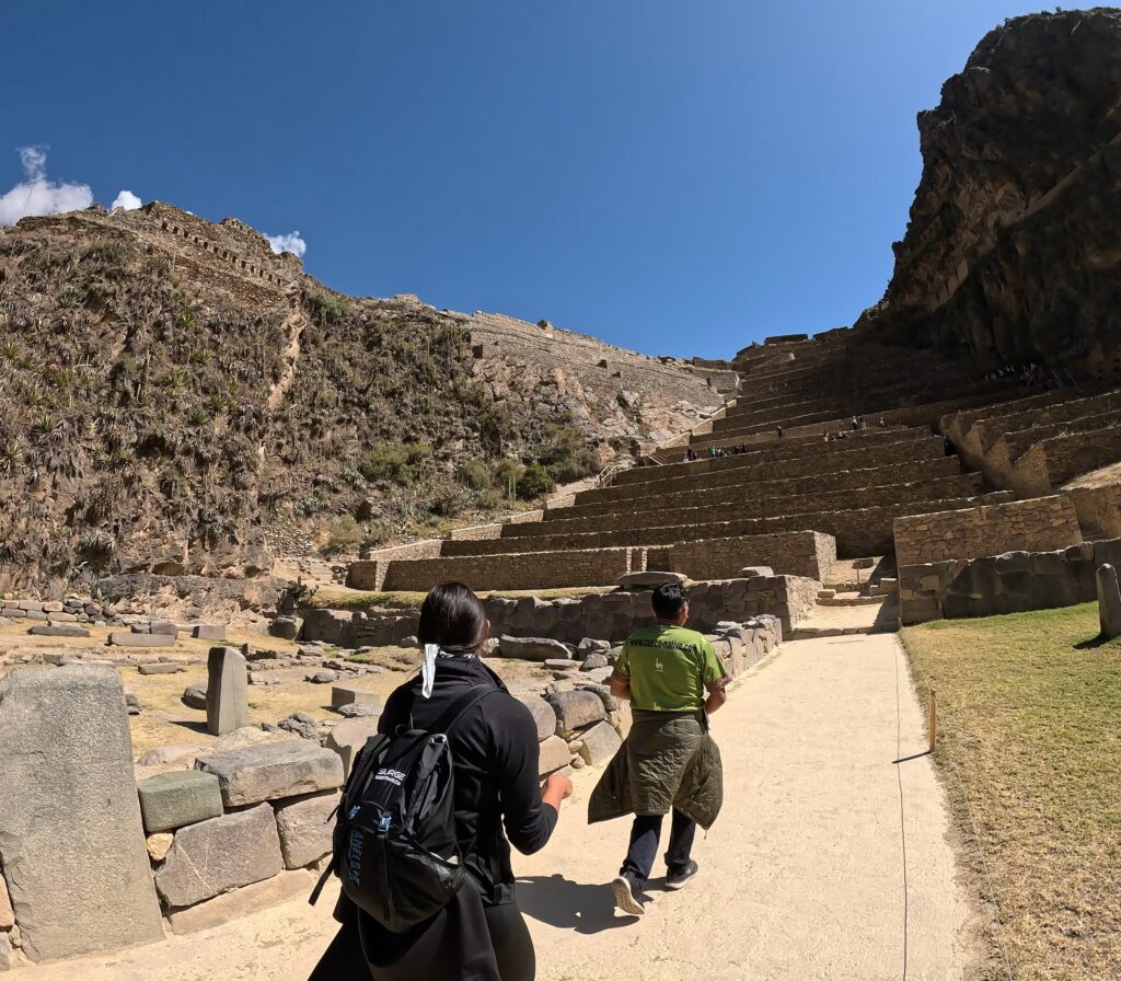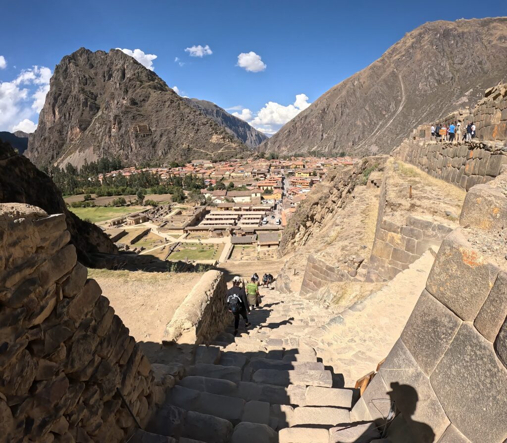 Ollantaytambo Archeological Site was one of the most memorable stops of our Cusco trip for me. The town at the foot of the hill is charming. We walked through the plaza to the entrance of the archaelogical site, which is accessed by a long flight of stairs.