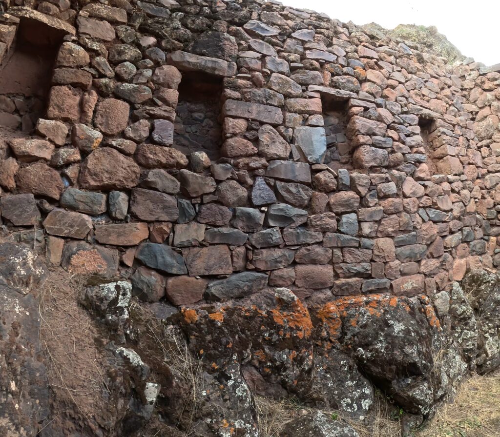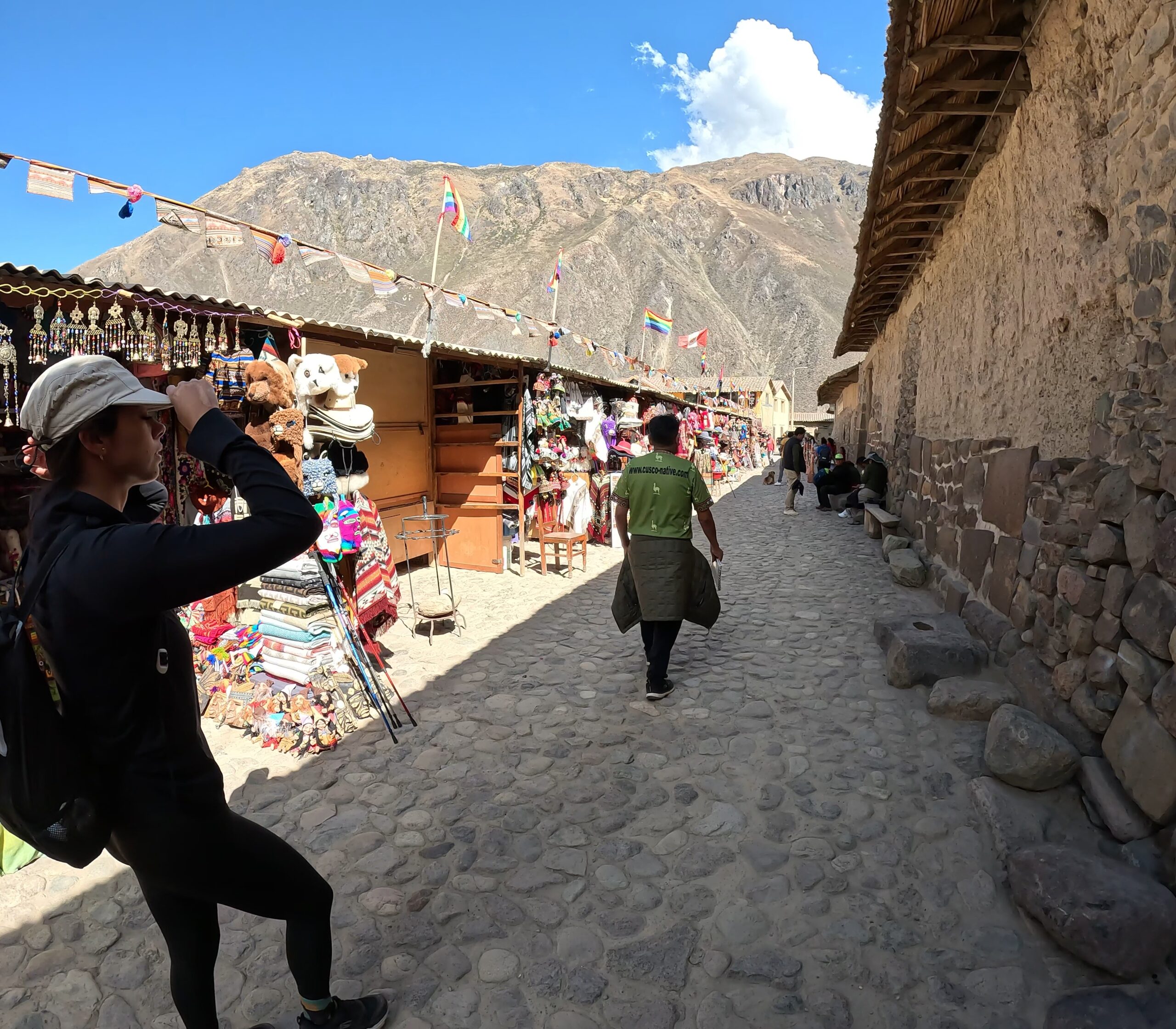 Locals sell artisanal goods to tourists in the square. There are sections where the rock is cut precisely, and others with uncut rock + mortar.
