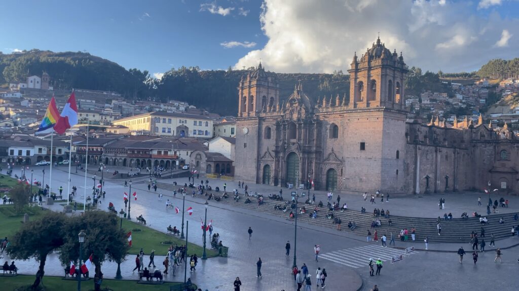 The previous evening, I boarded the PeruHop bus at 9:30 pm in Puno. We drove through the night to arrive in Cusco at 5:00 am. Indi had departed from Sacramento at 3:20 pm the previous day and arrived in Lima at 7:30 am. From there, she flew to Cusco and arrived at 10:45 am.