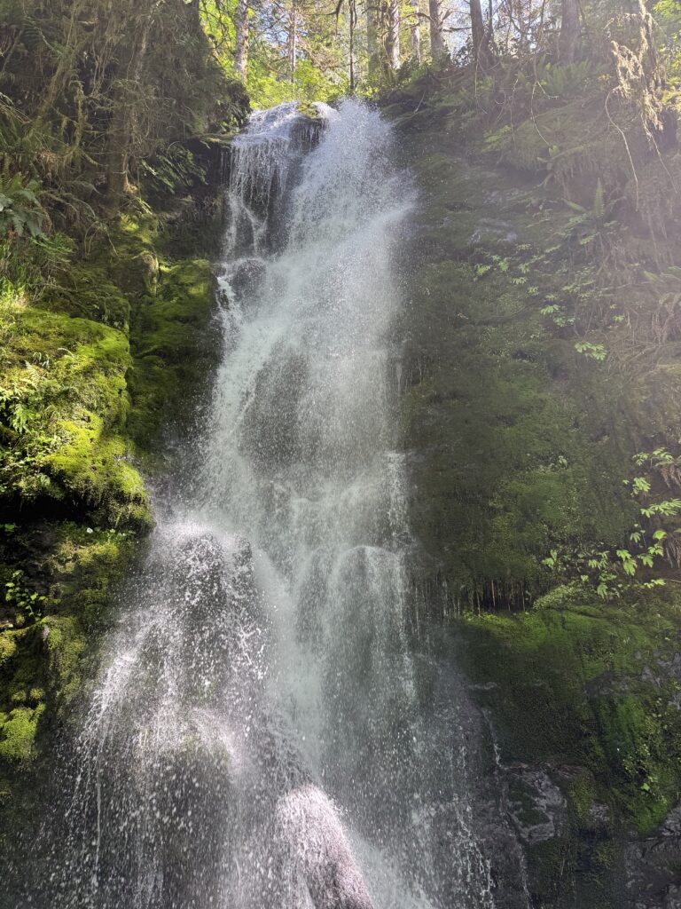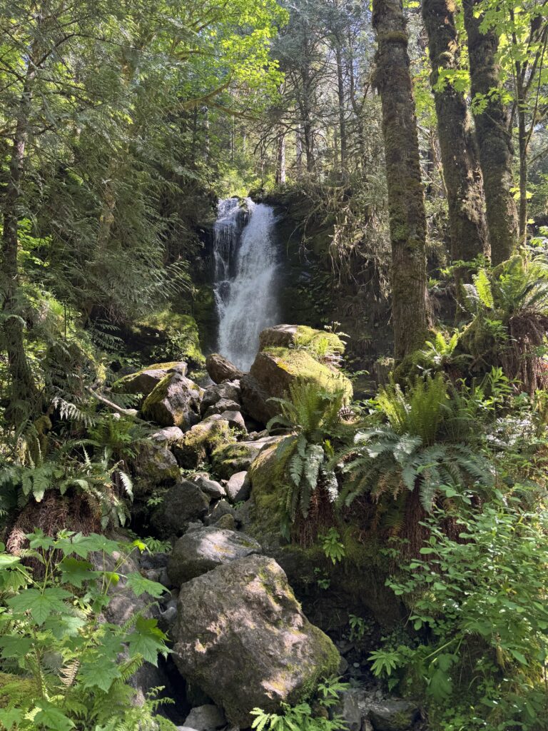 We took a short drive from Lake Quinault to Merriman Falls. It’s a small waterfall just off the side of the road. When we arrived, there was only one other car in the parking area. The setting was peaceful and photogenic. It was an easy and worthwhile stop.