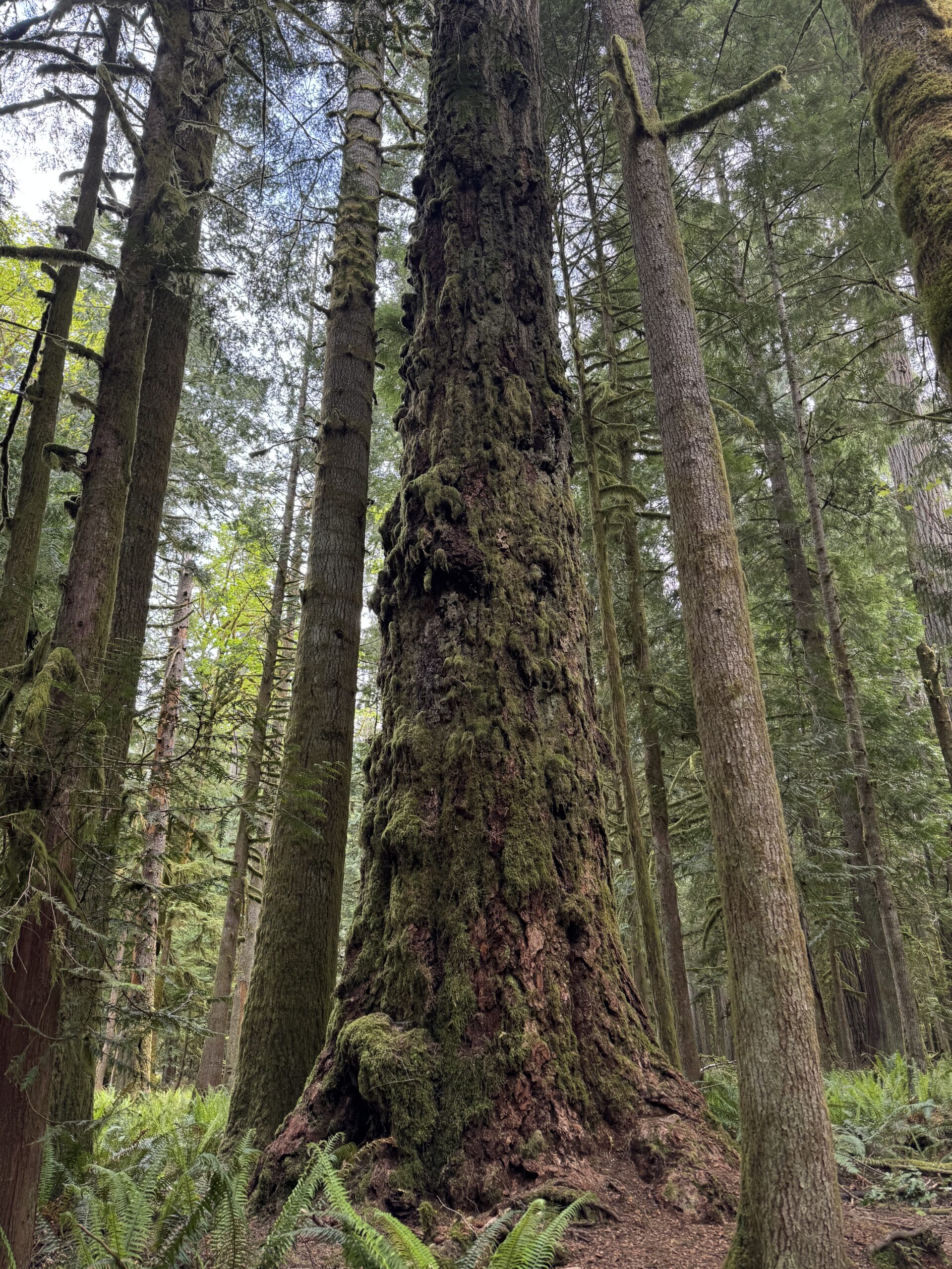 The trail led through the forest, passing massive, old Douglas fir trees.