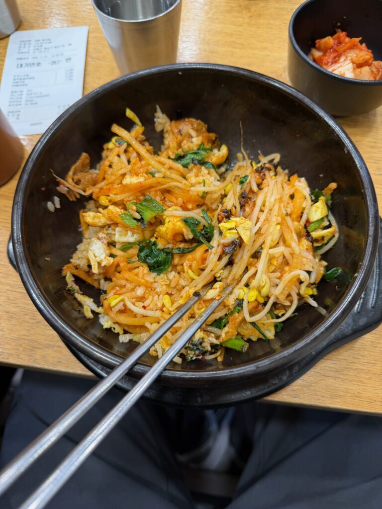 Some people were still hungry. Jonny got a mediocre $3 bibimbap at a place, and Indi got a similar gimbap from a different location of the same chain we ate the first night in Seoul. The four of us were sitting at the table with her, and a lady working there told us to get out because we weren’t paying customers. So we stood outside and watched her eat through the window alone in silence.