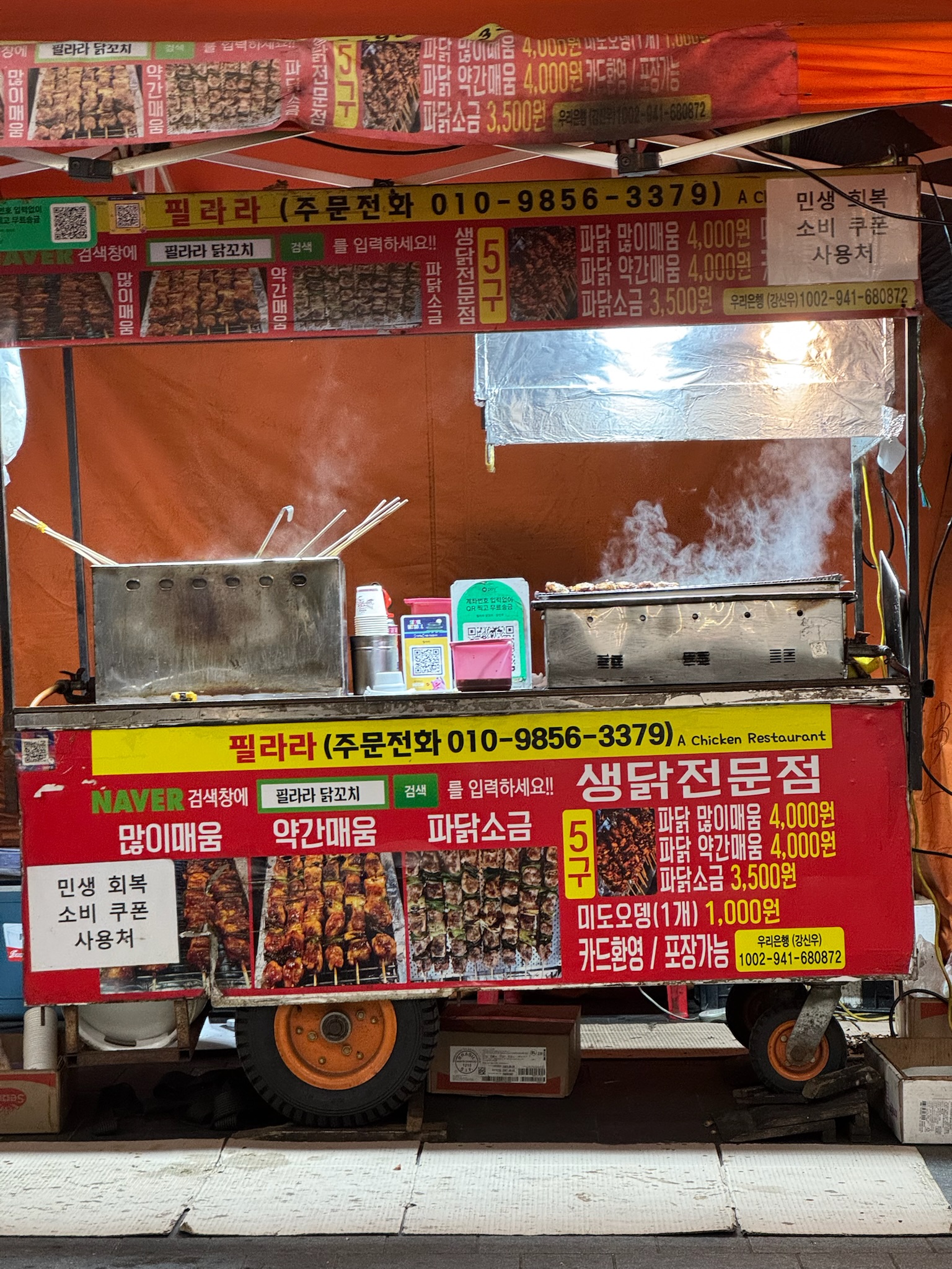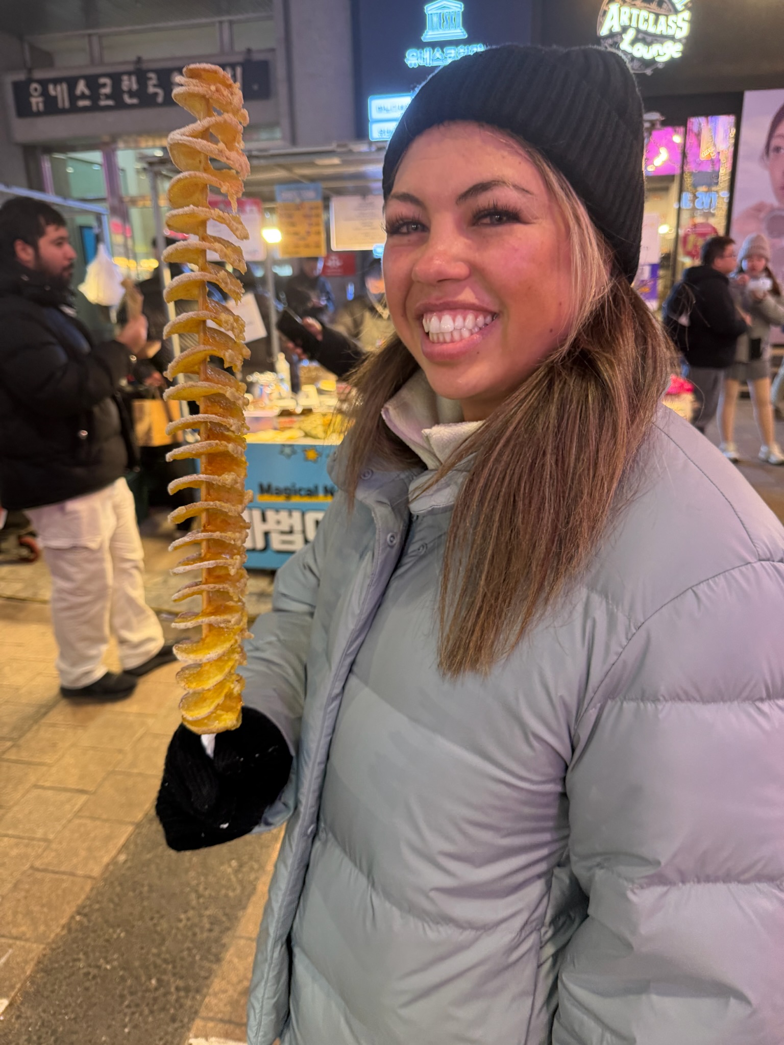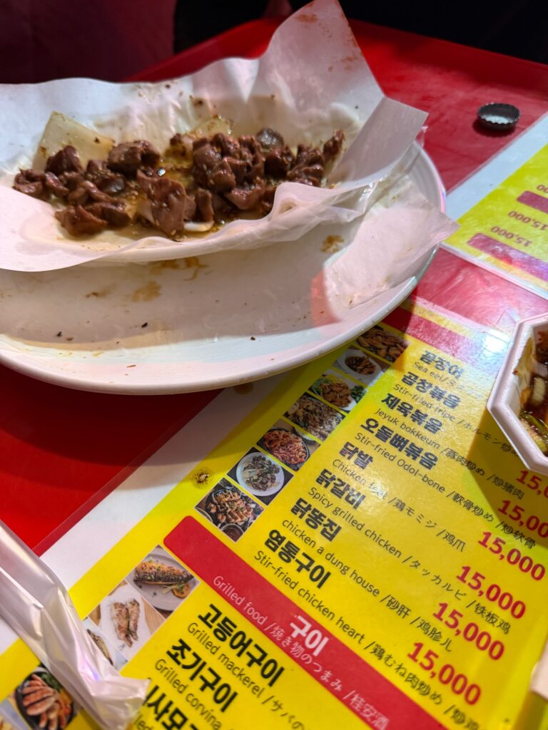 For dinner, we stopped at an outdoor food stall. Common throughout Seoul are red tents on the side of the road offering street food. Inside are small tables and chairs where you can sit and eat somewhere warm. We ordered a really good potato thing. We also ordered a chicken plate. He misunderstood which one I wanted and gave us a plate of chicken gizzards. As I write this, I’m still keeping them down by force of will. I ate the most of them of all of us by far. Jonny ate some, and the girls ate none. The flavor was fine – not much of anything besides the sesame seasoning. The flavor wasn’t the issue; the texture was awful. It reminded me of the texture of a semi-raw vegetable, but also chewy. The less we speak of it, the better.