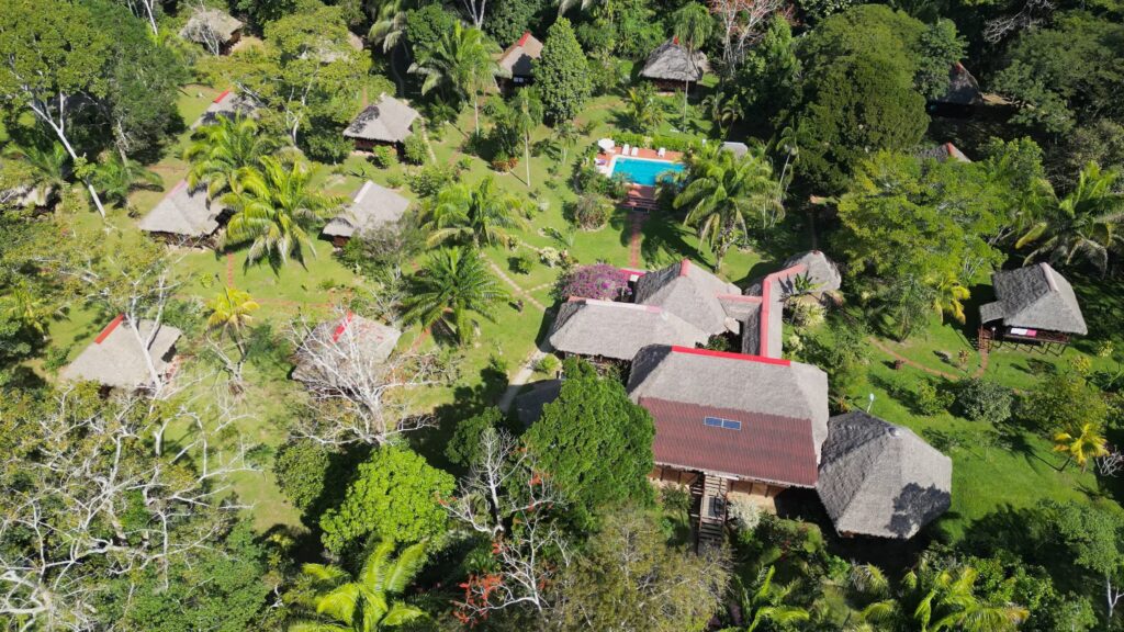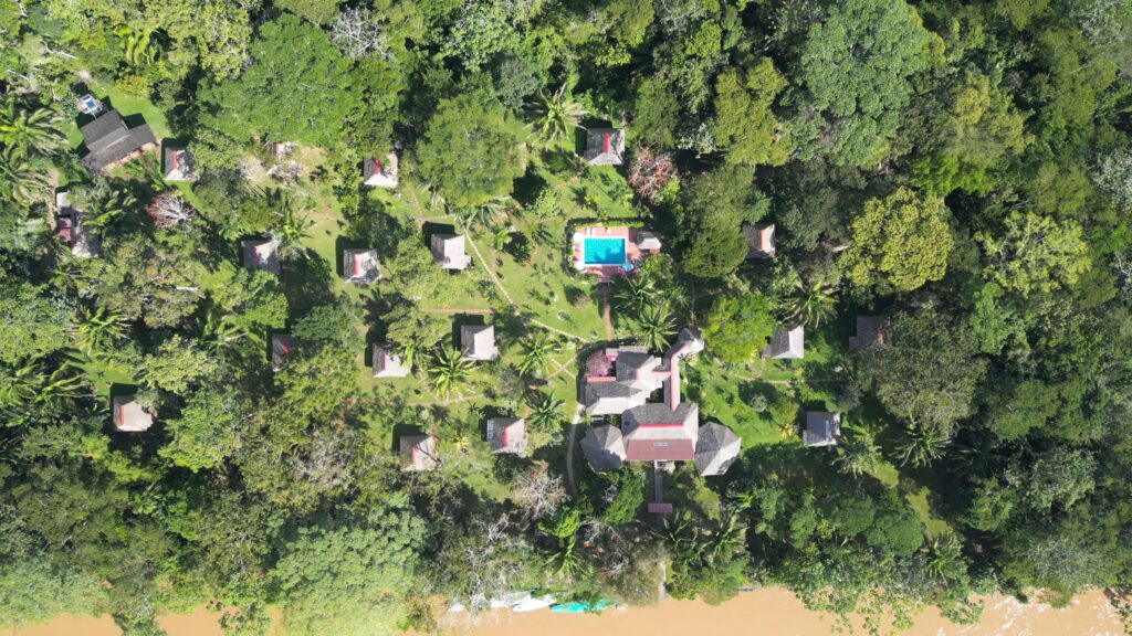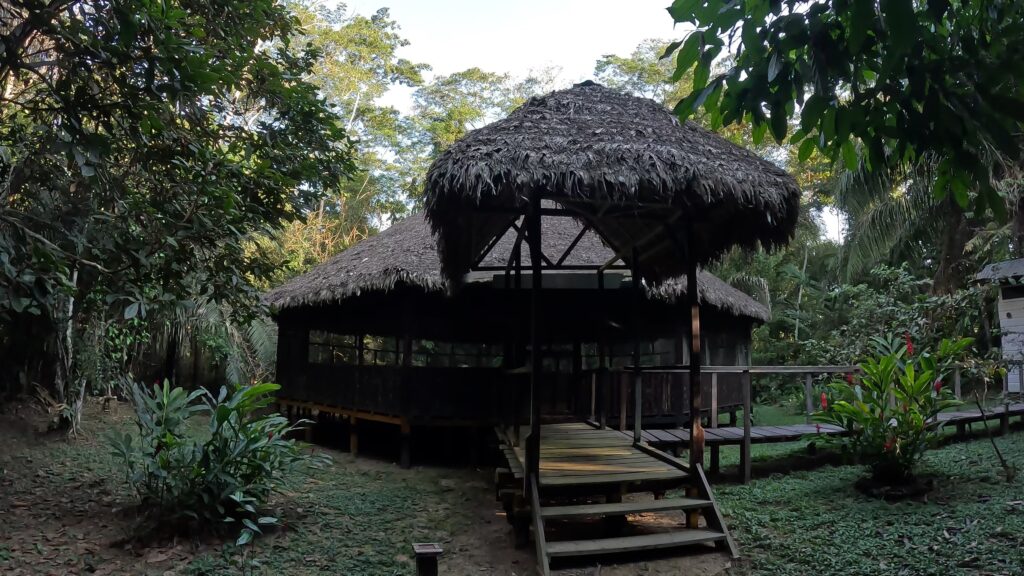 When you get off the boat, you’ll be looking at the main lodge. I loved the building’s aesthetic. It feels like something out of a movie set. The building is made from wood, and there are mosquito screens everywhere.