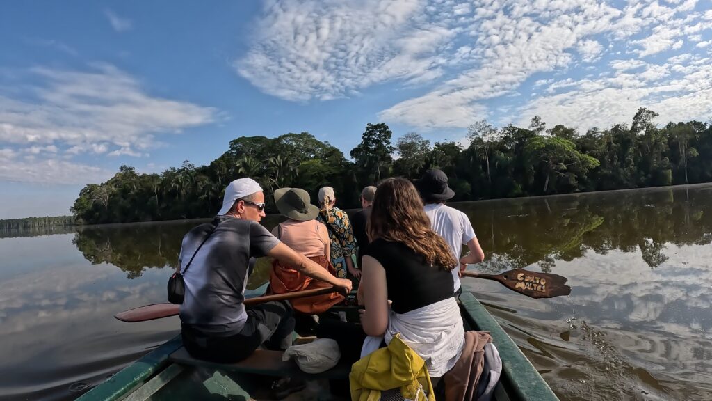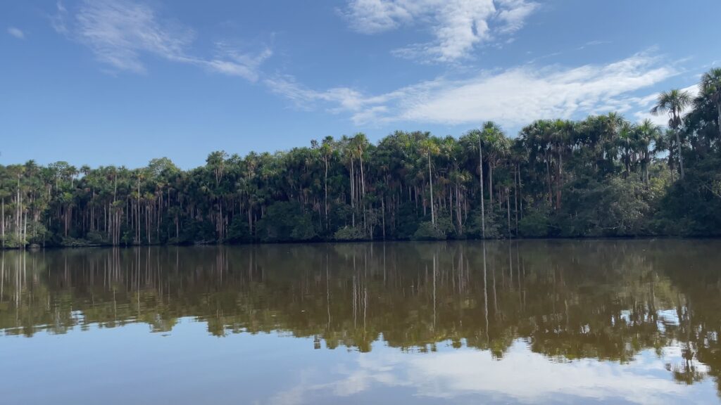 I cannot believe how much wildlife this lake sustains. This was a truly magical experience. There were all kinds of birds flying overhead from branch to branch and butterflies fluttering over the water. Almost immediately, we spotted a pack of giant river otters. They were mildly curious, and a couple poked their heads out of the water to stare at us.
